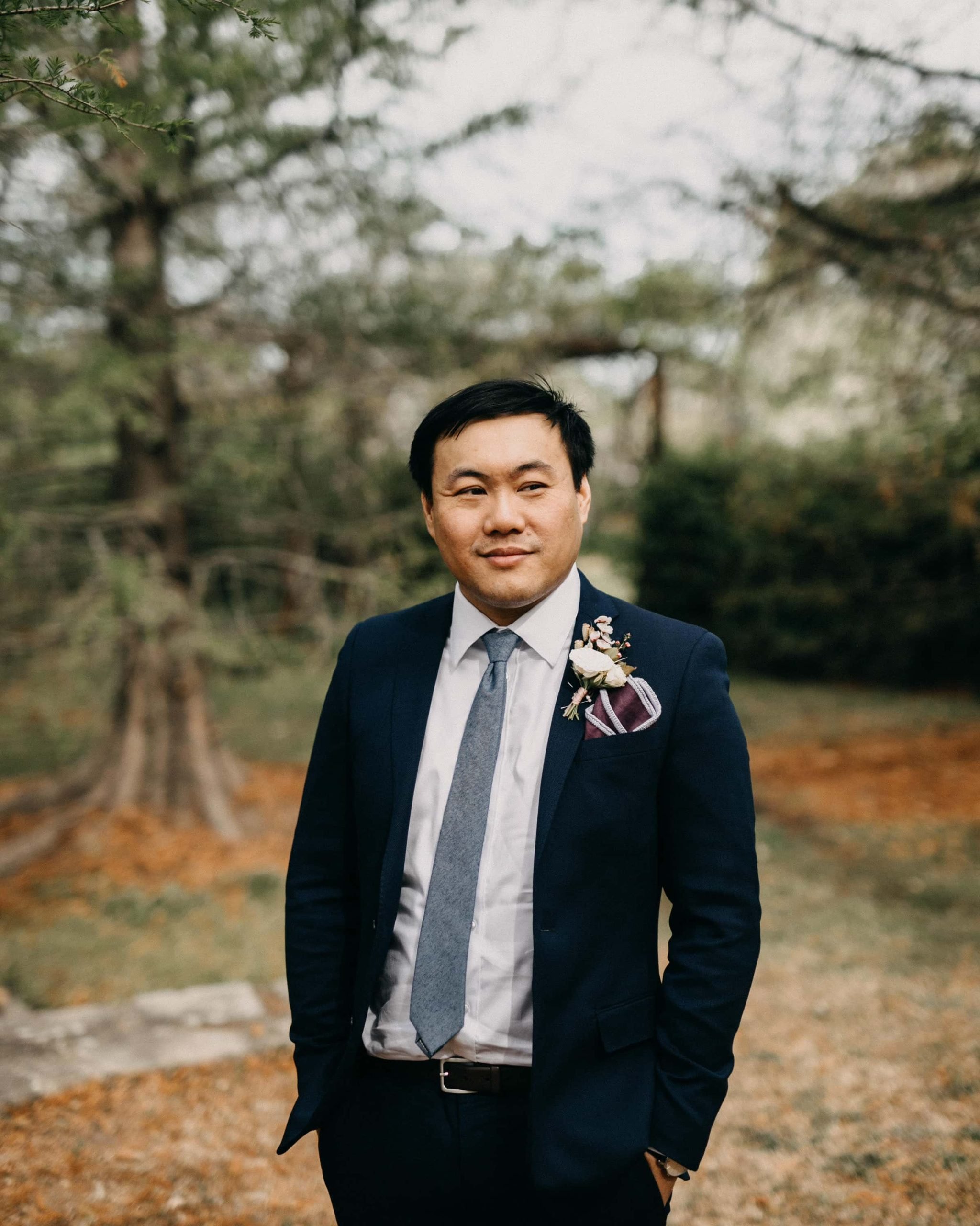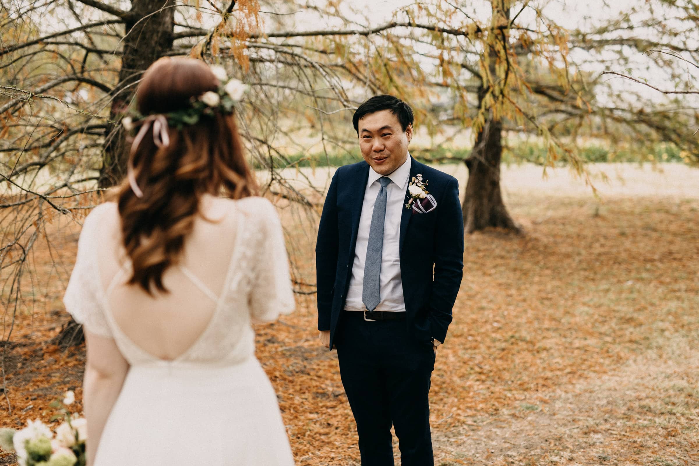 Albion Farm Gardens的秋意为这场婚礼增添了一份沉稳与浪漫.满地的落叶和斑驳的树影,营造出一种静谧的氛围.Bin静静地站在古老的树下等待,虽然没有旁人在场,但隔着屏幕都能感受到空气中弥漫着那一刻特有的紧张与期待.这是一个关于"等待"的最美注脚.